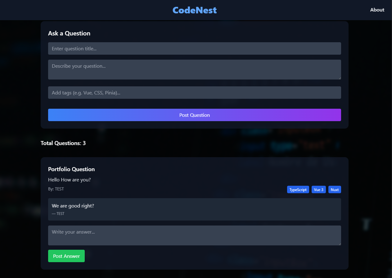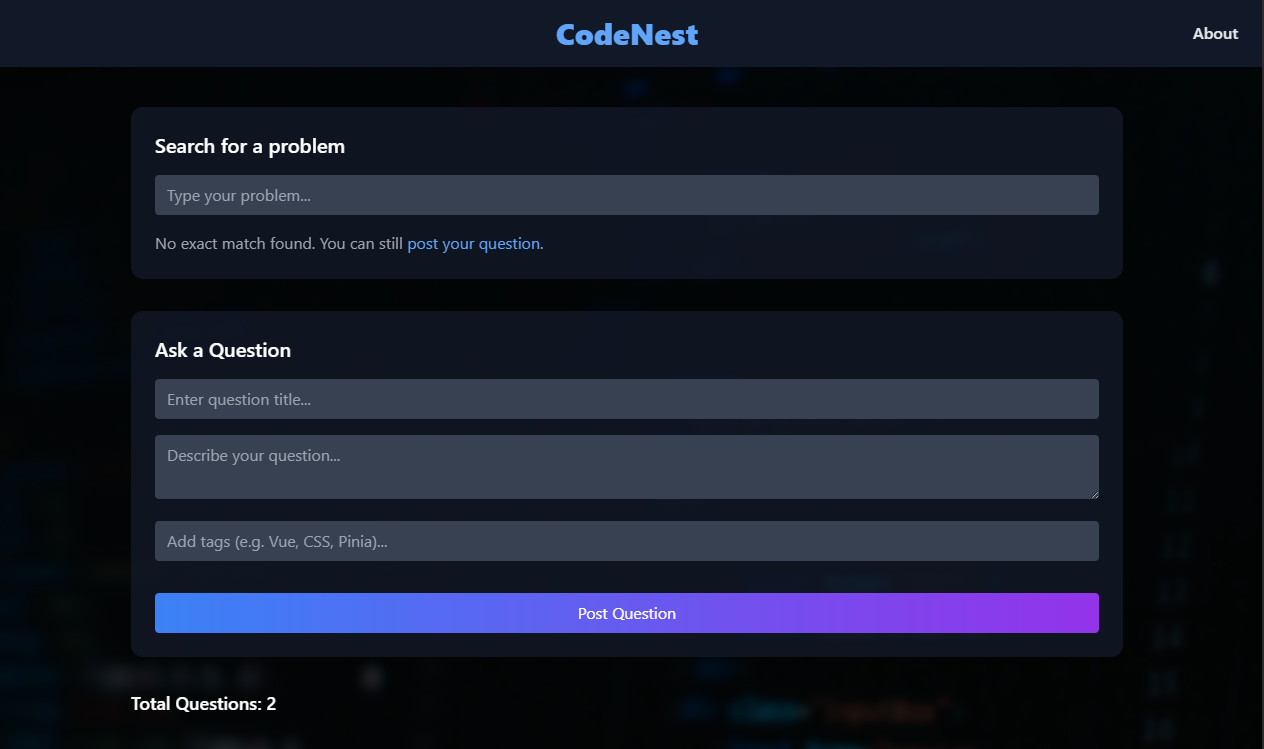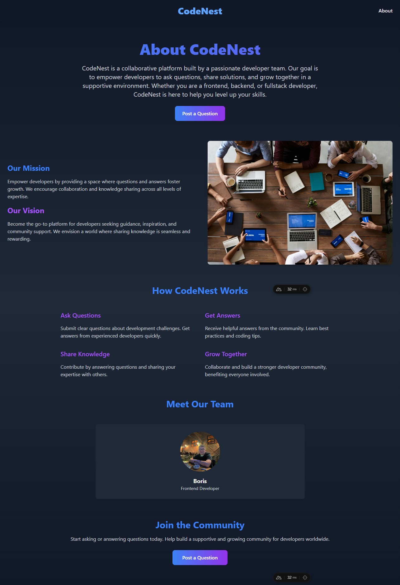 CodeNest is a modern, interactive platform built for developers of all levels to collaborate and learn. Users can post development questions, receive answers from the community, and contribute their own knowledge. The site features a clean, responsive interface with live updates, tag-based organization, and engaging visuals, optimized for desktop and mobile. It emphasizes community-driven growth, ease of use, and fostering a supportive environment for developers worldwide.