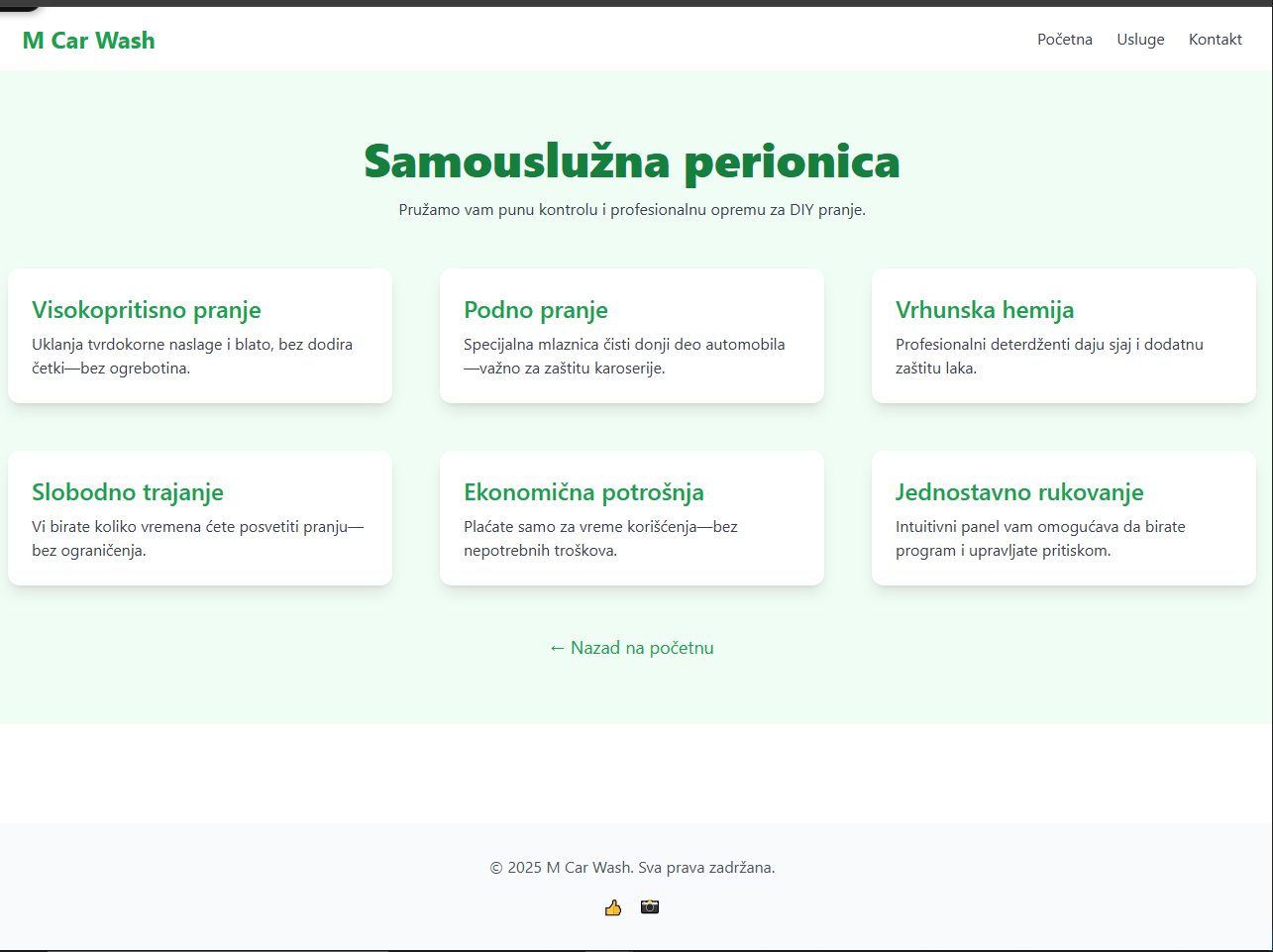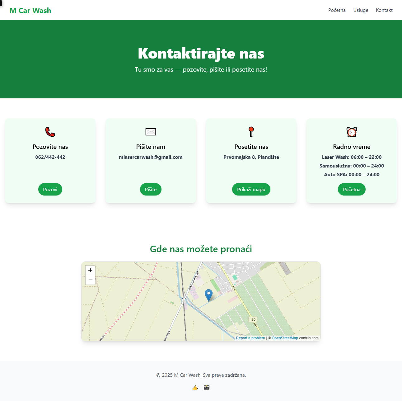 M-Car Wash is a modern promotional website created for the first contactless laser car wash in South Banat. The site highlights the state-of-the-art robot-wash system that ensures scratch-free cleaning and premium results. The landing page features smooth animations, engaging visuals, and an elegant responsive layout, optimized for both desktop and mobile visitors. Designed as a digital advertisement hub, it emphasizes innovation and reliability while promoting the brand's 10-year legacy.