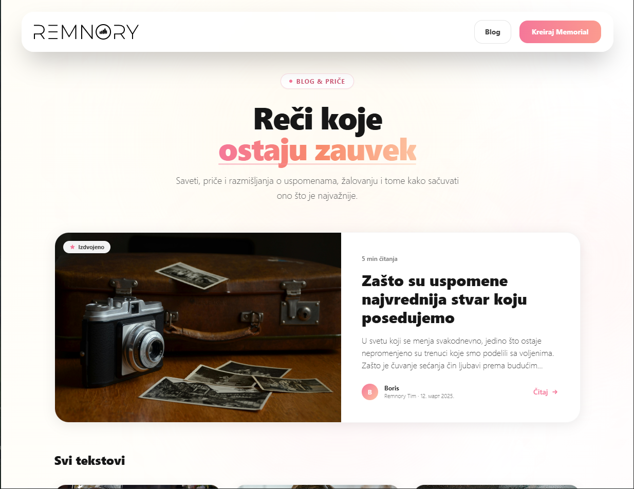 Remnory is a thoughtfully designed platform that allows users to capture, organize, and relive their personal memories through a clean and emotional digital experience. Built with a strong focus on storytelling and user experience, the application enables users to create and manage memory entries enriched with content. It features secure authentication, real-time data synchronization, and a responsive interface optimized for all devices. Remnory aims to provide a calm, intuitive space where users can preserve meaningful moments and revisit them anytime.